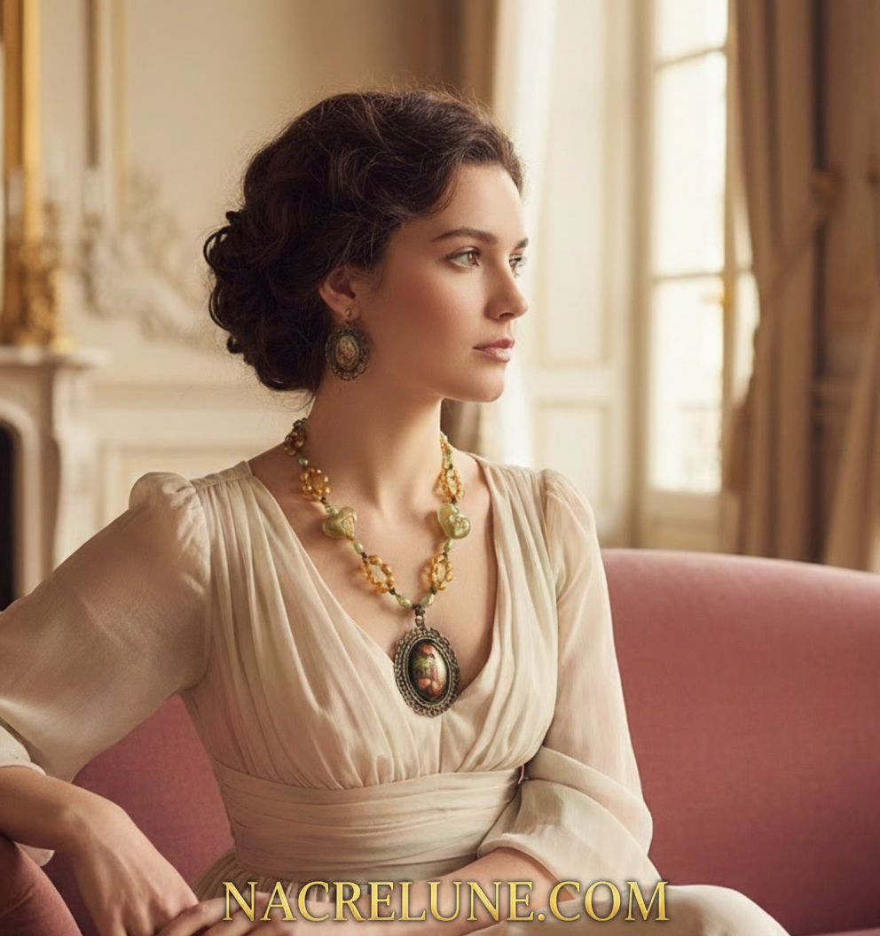 Construit avec soin, chaque élément de cette parure a été sélectionné pour sa qualité et son esthétique. Les perles de culture ajoutent une touche de luxe, tandis que le camée en verre apporte une originalité indéniable. Que ce soit pour une occasion spéciale ou pour ajouter une touche chic à votre quotidien, cette parure saura vous satisfaire.